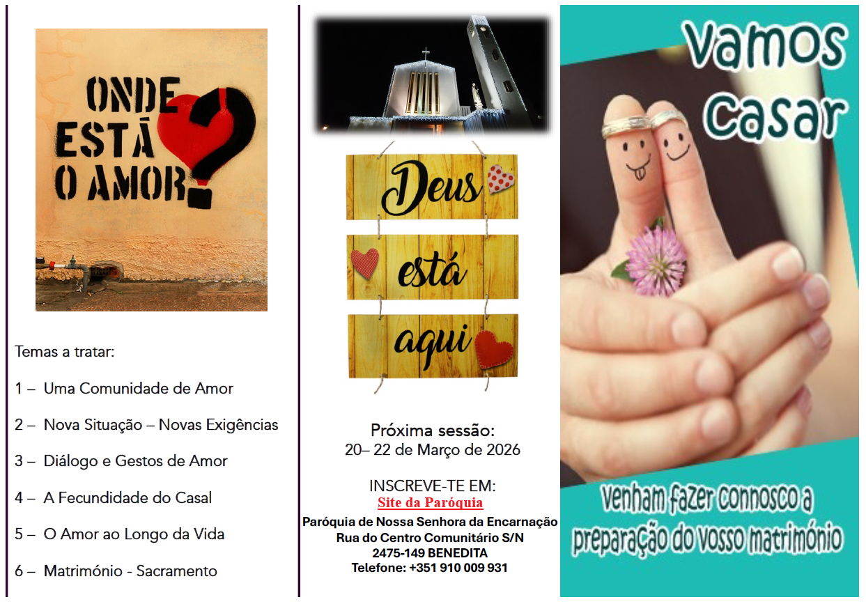 Nos dias 20, 21 e 22 de Março de 2026, irá acontecer na paróquia, os encontros para a preparação do matrimónio.